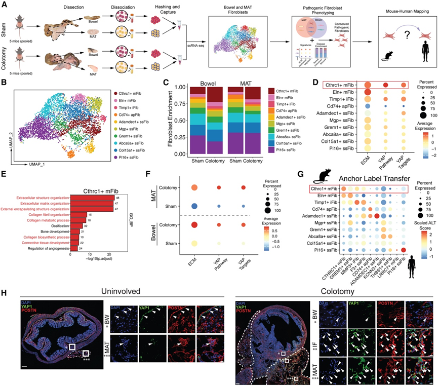 在确认小鼠模型与CD狭窄特征相符后,他们对术后第14天(POD 14)结肠切开术和假手术小鼠的肠道和MAT进行了scRNA-seq,以验证通过该模型是否也能捕获CTHRC1+机械敏感性成纤维细胞(图6A)。他们对成纤维细胞进行亚聚类,并鉴定出十个主要的全局簇,随后评估了这些簇的富集情况和表型(图6B)。在结肠切开术中富集的Cthrc1+成纤维细胞具有高表达的ECM、机械敏感性、迁移能力和病理成纤维细胞特征(图6C-F)。为了确定小鼠Cthrc1+成纤维细胞是否与人类CTHRC1+机械敏感性成纤维细胞类似,他们在小鼠成纤维细胞数据集和人类CD成纤维细胞图谱之间进行了锚定标记转移。小鼠Cthrc1+成纤维细胞与人类CTHRC1+成纤维细胞高度重合,表明这些成纤维细胞群在不同物种间保守(图 6G)。为了在蛋白水平上验证小鼠scRNA-seq结果,他们对 YAP1 和Cthrc1+成纤维细胞标记物 POSTN进行了共染色,结果显示,与未受累的 BW 和 MAT 相比,结肠切开术后的 MAT 和 IF 中核内 YAP1+POSTN+ 细胞数量显著增加(图 6H),这与人类狭窄中CTHRC1+成纤维细胞的扩增情况相似。
