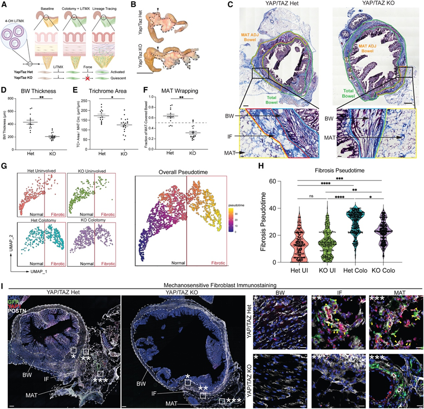 为了评估CF来源的成纤维细胞对肠道纤维化的贡献,他们构建了Col1a2-CreERT2; YAPlox/lox ;TAZlox/lox;ZsGreen+(YAP/TAZ基因敲除[KO])小鼠和Col1a2-CreERT2; YAPlox/+;TAZlox/+;ZsGreen+(YAP/TAZ杂合子[Het])小鼠作为对照。对这些小鼠进行单次LiTMX注射,然后进行结肠切开术,并在POD 14时处取材(图7A)。总体而言,他们观察到与YAP/TAZ Het小鼠相比,YAP/TAZ KO小鼠结肠切开部位周围的MAT包裹减少(图7B-C)。随后,他们分别定量分析了整个肠环以及仅在结肠切开部位或未受累区域由MAT覆盖的肠段的纤维化参数。在整个肠道中,YAP/TAZ Het小鼠和KO小鼠在未受累区域或结肠切开区域,BW和标准化三色染色阳性面积均无显著差异。相反,YAP/TAZ KO小鼠的肠壁厚度和标准化三色染色阳性面积均降低,但在未受累区域则无差异。此外,与YAP/TAZ杂合子小鼠相比,YAP/TAZ KO小鼠的IF处MAT覆盖率降低,纤维化ECM超微结构也较少(图7D-H)。这些结果表明,CF驱动的纤维化作用局限于MAT附近的肠壁,而非整体肠壁变薄所致。