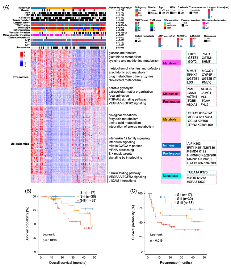 基因组、转录组和蛋白质组信息已用于将HCC分为亚组。泛素化蛋白组学和蛋白质组学数据可能为HCC患者寻找潜在的诊断生物标志物或治疗靶点提供新的见解和更多的机会。然后,他们基于蛋白质组学和泛素化蛋白组学进行无监督聚类,在85个肿瘤中鉴定出3个具有不同临床特征的亚组(S-I、S-II和S-III)(图4A)。