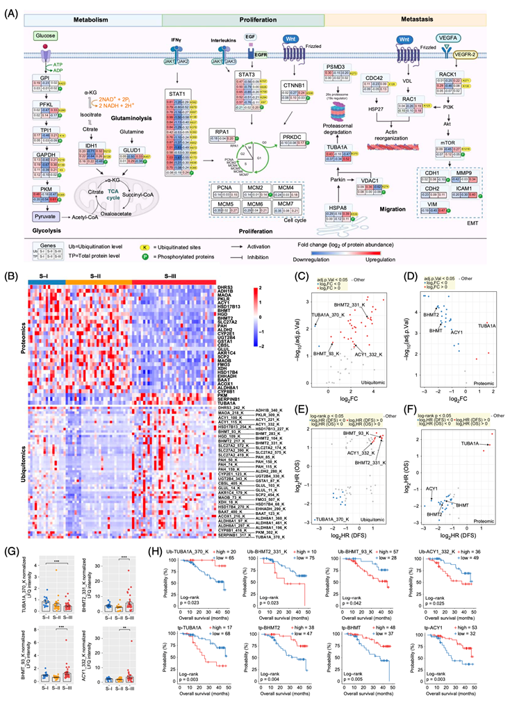 (A) 基于整合蛋白质组学分析的与S-III肿瘤相关的富集通路概述。(B) 通过蛋白质组学和泛素化蛋白组学分析,热图显示了31个总蛋白和56个泛素化修饰蛋白鉴定为S-III生物标志物。(C-D) 点图显示了不同蛋白表达。(E-F) 基于泛素化蛋白组学和蛋白质组学绘制56个泛素化修饰蛋白或31个总蛋白与OS或DFS的关系的点图。(G) 各亚组中泛素化修饰蛋白TUBA1A K370、BHMT2 K331、BHMT K93和ACY1 K332的表达。(H)生存分析。