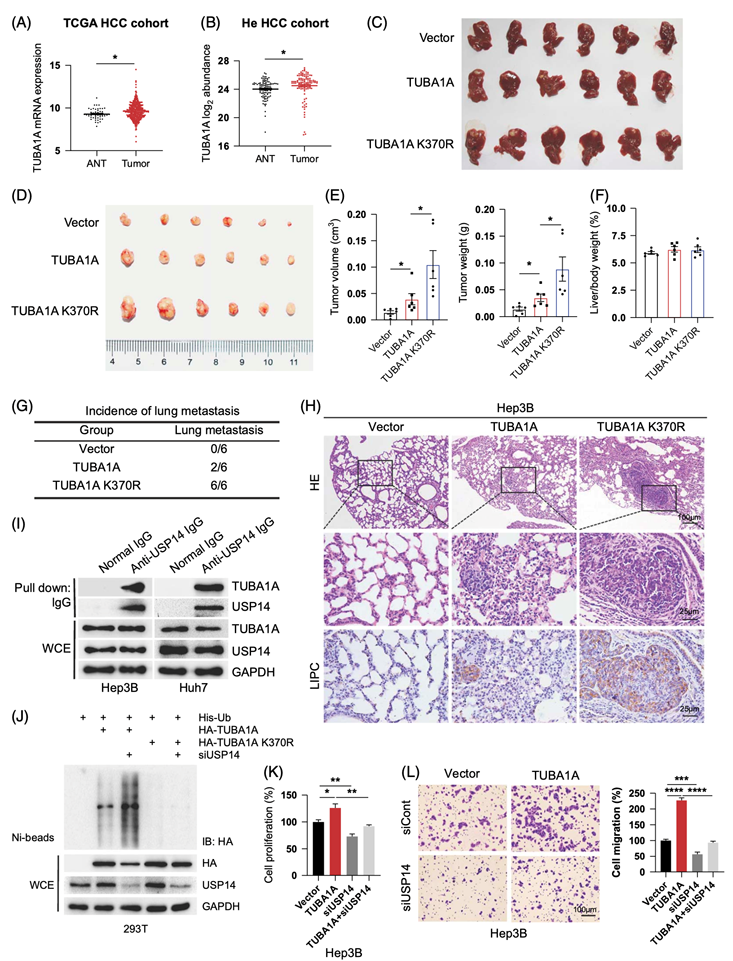 (A-B)结合公开队列数据分析。(C-H)体内侵袭实验。(I) USP14与内源性TUBA1A的相互作用。(J) USP14敲低增加TUBA1A多泛素化。(K-L)细胞增殖实验和侵袭实验。