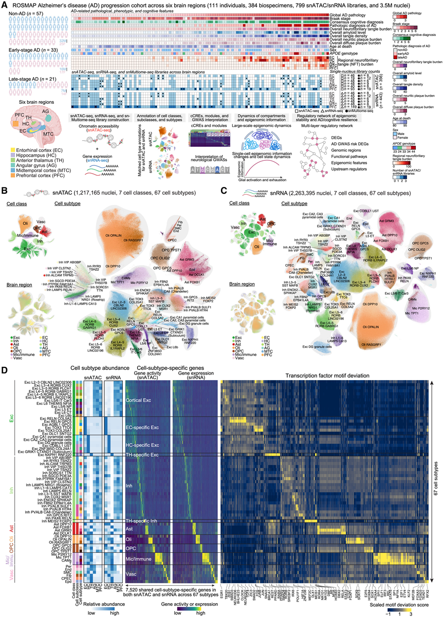 (a) 研究设计、ROSMAP 样本收集、单细胞分析和数据分析概述。(B-C) UMAP 可视化。 (D) 热图显示了大脑各区域的细胞亚型丰度(左)、多组学数据中 7520 个细胞亚型特异性基因的基因活性/表达(中)以及 TF 基序差异(右)。