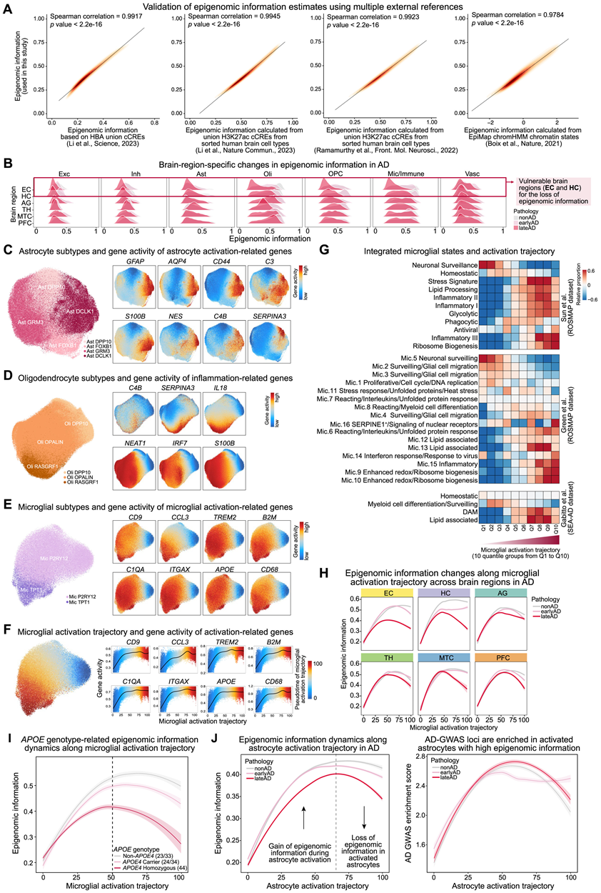 (a) 使用独立参考数据集验证表观基因组信息估计值。(B) 脊线图显示在AD进展过程中,不同主要细胞类别的脑区表观基因组信息变化的差异。(C) UMAP 图显示 Ast 亚型(左)以及 Ast 激活基因活性(右)。(D) UMAP 图显示 Oli 亚型(左)和 Oli 炎症基因的活性(右)。(E) UMAP 图显示小神经胶质细胞(Mic) 亚型(左)以及小胶质细胞活化基因的活性(右)。(F) UMAP 和轨迹图展示了小胶质细胞活化轨迹和相关基因活动动态。(G) 热图显示了小胶质细胞状态的相对比例。(H) 线图显示了表观基因组信息沿着三个 AD 病理组的六个大脑区域中的小胶质细胞活化轨迹的变化,揭示了在早期小胶质细胞活化期间表观基因组信息最初增加,随后在晚期AD 终末活化的小胶质细胞中表观基因组信息明显丢失,特别是在最脆弱的 EC 和 HC 大脑区域。(I) APOE基因型相关的表观基因组信息在小胶质细胞活化过程中的变化。(J) 左图:线图显示AD病理组所有脑区Ast激活轨迹上的表观基因组信息变化,揭示了在早期Ast激活期间表观基因组信息最初增加,随后在AD晚期激活的Ast中表观基因组信息明显丢失。右图:线图显示AD相关GWAS沿Ast激活轨迹的富集情况,表明具有更高表观基因组信息的Ast在AD遗传风险位点上的富集程度更高。