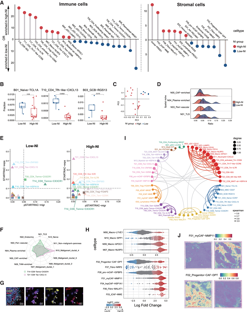 (A) 棒棒糖图显示通过 Ro/e 分析计算得出的高 NI(红色)和低 NI(蓝色)肿瘤组织中每个免疫细胞亚群和基质细胞亚群的相对富集程度。(B) 比较21个切片中高NI组和低NI组三个免疫细胞亚群的比例。(C) 基于空间微环境比例的21个肿瘤样本的主成分分析(PCA)。(D) 脊线图显示整个切片中空间微环境的比例。(E) 散点图显示低NI组和高NI组T细胞亚群的扩增指数和成对迁移指数,这些结果通过STARTRAC分析得出。(F)雷达图显示了 CD8_Temra-CX3CR1(绿色)和 CD8_Tex-CXCL13(粉色)在不同空间位置的比例。(G) mIHC 染色显示低 NI PDAC 肿瘤样本 PA#12 中 TLS 周边存在 CD8 + CX3CR1 + NKG7 + T14_CD8_Temra-CX3CR1。(H) 使用 miloR 绘制的蜂群图,展示了包含不同巨噬细胞和成纤维细胞亚群的细胞邻域中变化的分布。(I) 肿瘤组织中不同亚聚类的共现情况。(J) 代表性低 NI 样本 PA#72(左)和代表性高 NI 样本 PA#11(右)中 F01_myCAF-MMP11 和 F02_Progenitor-CAF-DPT 的定位和比例。