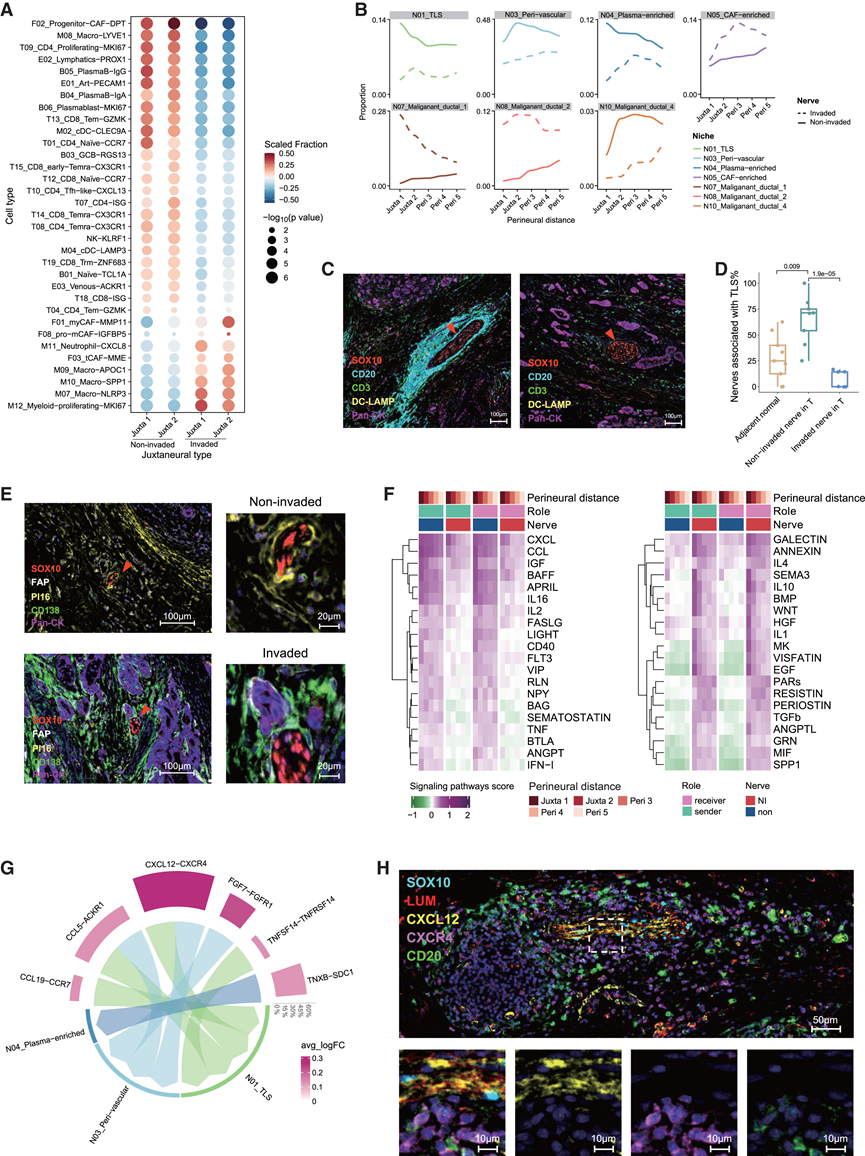 (A) 点状图热图显示在侵袭性或非侵袭性近神经微环境中显著富集的亚聚类。(B) 从距离神经最远的点到与神经相邻的最近点的5个点的空间微环境比例。(C) mIHC 染色显示了代表性未侵入神经和代表性侵入神经周围的微环境。(D)箱线图显示9对相邻正常和肿瘤组织(T)样本中与TLS(距神经边界100 μm以内)相关的未受侵袭神经或受侵袭神经的百分比。(E) mIHC 染色分析。(F) 热图显示了由 COMMOT 计算的信号通路评分。(G) Circos 图显示非侵袭神经(发送者)产生的配体与 2 个点范围内的空间位点(接收者)产生的配体之间的配体-受体对。(H) mIHC 染色显示 PDAC 肿瘤切片 PA#47 中 LUM +成纤维细胞和未侵入神经周围的CXCR4 + CD20 + B 细胞表达 CXCL12。