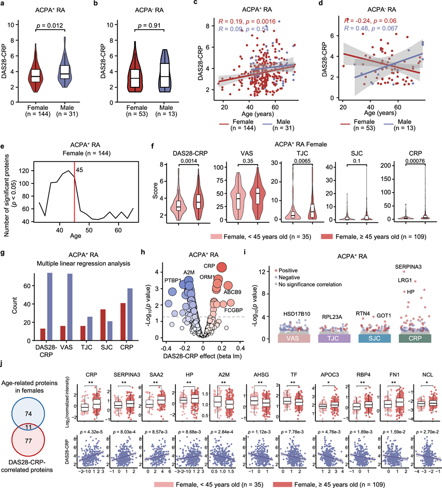 (a-b) ACPA 阳性或 ACPA 阴性RA 患者按性别分组的 DAS28-CRP 评分小提琴图。(c-d) 带有拟合回归线的散点图,说明ACPA 阳性或 ACPA 阴性 RA中按性别分组的年龄和 DAS28-CRP 之间的Spearman 相关性。(e) ACPA 阳性女性中不同年龄段蛋白质的DE-SWAN 分析。(f) 小提琴图显示 45 岁以上和以下 ACPA 阳性女性中 DAS28-CRP 和 4 项临床指标( VAS、SJC、TJC 和 CRP)的年龄特异性差异。(g-i) ACPA 阳性 RA 患者 ( n = 175) 的 DAS28-CRP 指标与蛋白质之间的多元线性回归分析。(j) 维恩图显示在 45 岁以下和 45 岁以上 ACPA 阳性女性之间表现出显著变化或与 DAS28-CRP 显著相关的蛋白质的重叠(左)。箱线图(右上)显示 45 岁以下和 45 岁以上 ACPA 阳性女性之间重叠蛋白质的标准化强度。散点图(右下方)显示蛋白质与 DAS28-CRP 之间的回归分析。