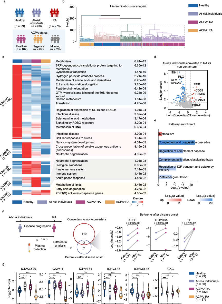 (a) 不同临床亚组中的个体数量。(b) 树状图显示了跨样本蛋白质组数据的层次聚类。(c) 热图显示了健康个体、高危个体、ACPA 阳性 RA 患者和 ACPA 阴性 RA 患者中蛋白质的无监督 k 均值聚类。(d) 差异表达蛋白 (DEP)火山图。(e)通路富集分析。(f) 从三名高危个体在 RA 发病前后采集的样本的蛋白质组学分析设计示意图(左),维恩图(中间)显示两次比较中重叠的 DEP,散点图(右)显示 RA 发病前后重叠 DEP 的强度。(g) 小提琴图显示四个临床组中抗体片段的强度。
