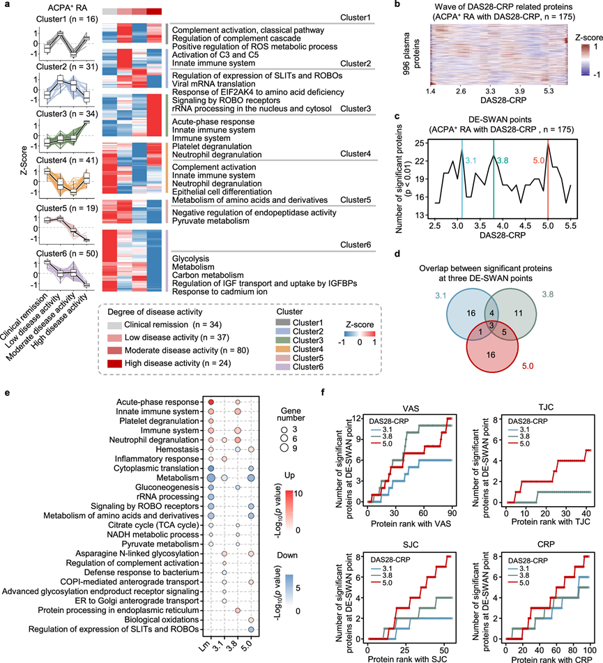 血浆蛋白与DAS28-CRP之间的关系错综复杂,超越了线性关联。为了解读DAS28-CRP(评估疾病活性最重要的参数)随蛋白质组动力学波动的复杂性,人们采用了两种策略。首先,为了研究基于临床分类的蛋白质组学差异,他们根据 DAS28-CRP 将 ACPA 阳性 RA 患者分为四组:(I)缓解(<2.6),(II)低度(2.6-3.2),(III)中度(3.2-5.1)和(IV)高(>5.1)。为了降低蛋白质组固有的复杂性,他们使用无监督的层次聚类将具有相似轨迹的蛋白质分组,从而产生六个不同的聚类(图 4a)。在聚类3 中,随着疾病活性的增加,与急性期反应、先天免疫和中性粒细胞活性相关的蛋白质呈上升趋势。在聚类6 中,参与碳代谢、IGF 转运和糖酵解的蛋白质随着 DAS28-CRP 的增加而持续减少。聚类5 和 聚类2 中的蛋白质参与丙酮酸代谢、ROBO 信号传导和翻译相关过程,值得注意的是,聚类1和聚类4中补体的波动表明,随着疾病活性水平的变化,补体成分的激活和消耗之间存在动态平衡。对ACPA阴性RA患者进行的类似分析揭示了与ACPA阳性RA患者的差异。ACPA阴性RA患者通常表现出先天免疫活性增强(随疾病活性增加而降低)、适应性免疫反应(例如抗原呈递和T细胞受体信号传导)减弱,以及氨基酸代谢和轴突导向显著增强。总体而言,这些结果表明,某些血浆蛋白随DAS28-CRP水平升高的变化呈非线性。