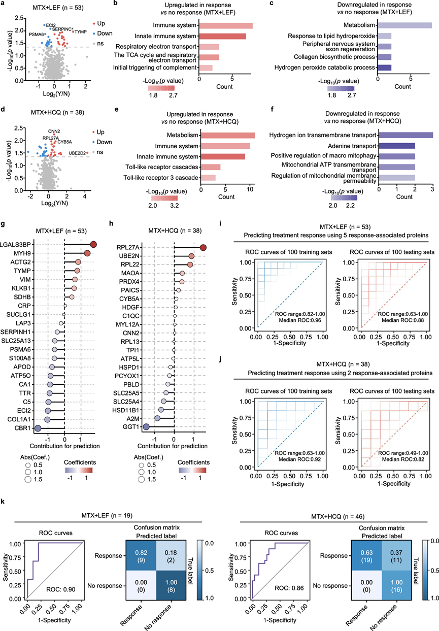 (a)MTX + LEF 治疗有反应和无反应之间的 DEP 火山图。(b-c) 蛋白质的富集分析。(d) MTX + HCQ 治疗有反应和无反应之间的DEP火山图。(e-f) 对 MTX + HCQ 治疗有反应和无反应的上调和下调蛋白质的富集分析。(g-h) LASSO 回归分析显示 DEP对 MTX + LEF和 MTX + HCQ组 治疗反应预测的贡献。(i-j) ROC 曲线显示了 LASSO 模型对 MTX + LEF 和 MTX + HCQ 疗效的预测性能。(k) ROC曲线显示了整合 ELISA 测量的蛋白质水平后的模型性能。