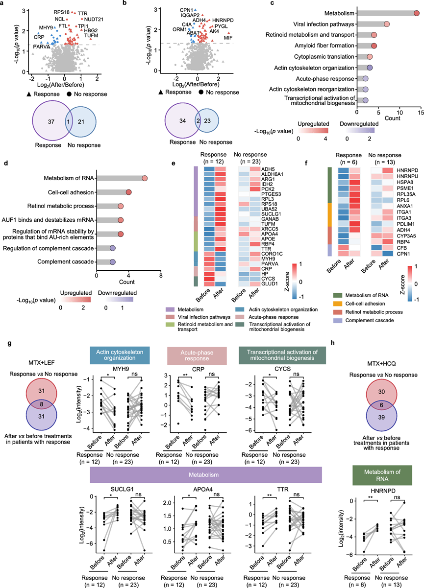 (a) 火山图显示 MTX + LEF 治疗前后的 DEP。(b) 火山图显示 MTX + HCQ 治疗前后的 DEP。(c) MTX + LEF 治疗前后 DEP 的通路富集分析。(d) MTX + HCQ 治疗前后 DEP 的通路富集分析。(e) MTX + LEF 治疗前后 DEP 相对丰度的热图,按反应分开。(f) MTX + HCQ 治疗前后 DEP 相对丰度的热图。(g-h) 维恩图显示 MTX + LEF和 MTX + HCQ疗法的治疗相关蛋白和反应相关蛋白的重叠。