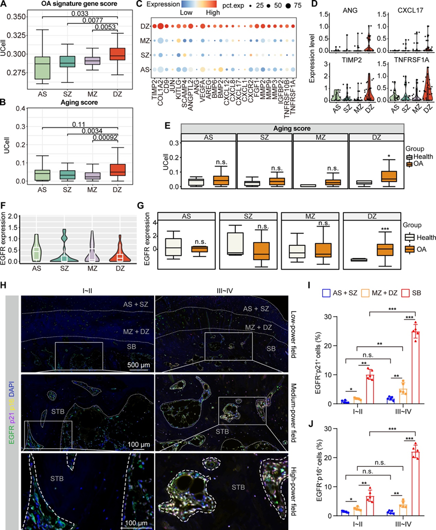 (A) 关节面 (AS)、浅表区 (SZ)、中层 (MZ) 和深层 (DZ) 组的 OA 特征基因评分。(B) AS、SZ、MZ 和 DZ 组的衰老评分。(C) 点图显示 AS、SZ、MZ 和 DZ 组中衰老基因的表达。(D) 小提琴图显示 AS、SZ、MZ 和 DZ 组中代表性衰老基因的表达。(E) 箱线图显示 AS、SZ、MZ 和 DZ 组中健康人和 OA 患者的衰老评分。(F) 小提琴图显示AS、SZ、MZ 和 DZ 组中EGFR基因的表达。(G) 箱线图显示AS、SZ、MZ 和 DZ 组中健康人群与 OA 患者之间EGFR基因表达的情况。(H) 多重免疫荧光染色显示 OA 患者 I~II 侧和 III~IV 侧软骨下骨组织中 p21、p16 和 EGFR 的共同表达。(I) 从随机选择的五个低倍视野进行半定量分析。(J) 从随机选择的五个低倍视野进行半定量分析。