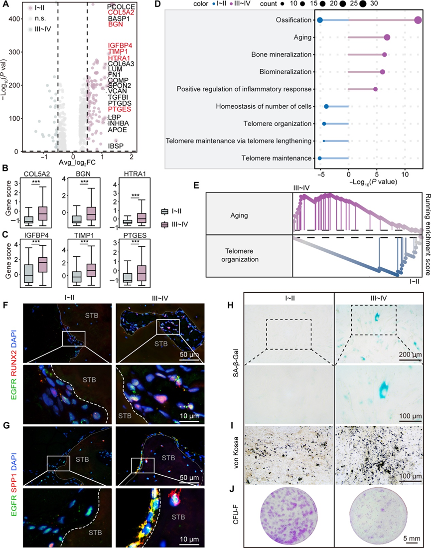 (A) EGFR+衰老MDSPC中I~II和III~IV侧组织之间的差异表达基因。(B) 代表性成骨基因的表达。(C) 箱线图显示EGFR+衰老MDSPC中I~II和III~IV侧组织之间代表性衰老基因的表达。(D) GO分析。(E) 基因集富集分析。(F) 免疫荧光染色显示 OA 患者的 I~II 和 III~IV 侧软骨下骨组织中 RUNX2 与 EGFR 共同表达。(G) 免疫荧光染色显示 OA 患者的 I~II 和 III~IV 侧软骨下骨组织中 SPP1 与 EGFR 共同表达。(H) 对来自 I~II 和 III~IV 侧组织的 EGFR + acMDSPC进行 β-半乳糖苷酶染色。(I) 对来自 I~II 和 III~IV 侧组织的 EGFR+ acMDSPC进行von Kossa染色。(J) 结晶紫染色。