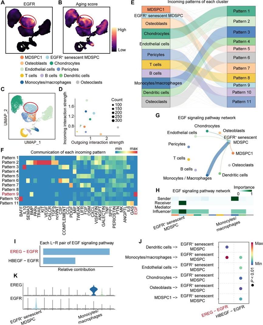 干细胞位于称为“微环境”的特定微环境中,该微环境维持和调节干细胞的生物学特性。干细胞及其微环境共同构成再生单位,在组织发育、稳态维持、再生和衰老中发挥至关重要的作用。为了进一步研究EGFR+衰老MDSPC微环境的细胞组成,他们进行了细胞间通讯分析,特别关注EGFR+衰老MDSPC。基于EGFR基因的表达和高衰老评分区(图5A-B),将12个细胞亚群重新分类,得到11个细胞亚群(包括EGFR+衰老MDSPC)(图5C)。随后他们分析了每个亚群的传入和传出相互作用信号。结果表明,EGFR+衰老MDSPC表现出相对较强的传入相互作用信号(图5D)。