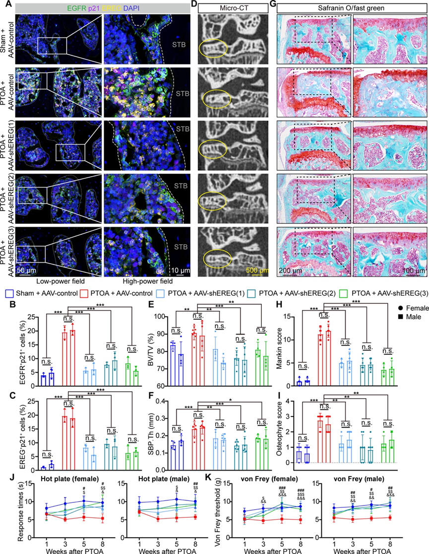 (A) 多重免疫荧光染色显示 8 周时不同组别的 PTOA 小鼠关节软骨下骨组织中 EGFR、p21 和 EREG 的共同表达。(B-C) 从三个随机选择的低倍视野进行半定量分析,显示软骨下骨中EGFR+ p21+细胞和EREG+p21+ 细胞的细胞比例。(D) 每组的代表性微型计算机断层扫描 (micro-CT) 图像。(E) 每组的骨体积分数 (BV/TV)。(F) 每组的软骨下骨板 (SBP) 厚度 (SBP.Th)。(G) 8 周时每组的番红 O/固绿染色。(H) 基于番红 O/固绿染色的每组 Mankin 评分。(I) 通过番红O/固绿染色确定各组的骨赘评分。(J) PTOA建模后1、3、5和8周进行的热板测试,显示各组小鼠的疼痛反应时间。(K) PTOA建模后1、3、5和8周进行的von Frey测试。