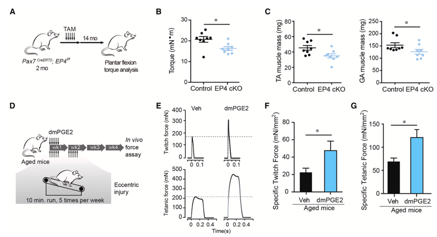 体育锻炼对健康有很大益处,并通过肥大和 MuSC 介导的修复触发肌肉重塑。为了评估 PGE2 是否可以克服运动介导的肌肉重塑中与年龄相关的缺陷,他们用不可水解的 PGE2 类似物[16,16-二甲基PGE2 (dmPGE2)]处理老年小鼠 5 天,并让它们每天进行下坡跑,这是一种离心运动(图1D)。dmPGE2 可通过增加衰老肌肉中的 15-PGDH 活性来抵抗降解。在运动训练方案实施 2 周后,他们发现与载体处理的对照组相比,dmPGE2 处理的 GA 肌肉的特定抽搐和强直力量均显著增加(图 1E-G)。这些结果表明,短期 dmPGE2 治疗与运动同时进行,可以克服衰老的肌肉微环境并实现肌肉力量的长期增强。