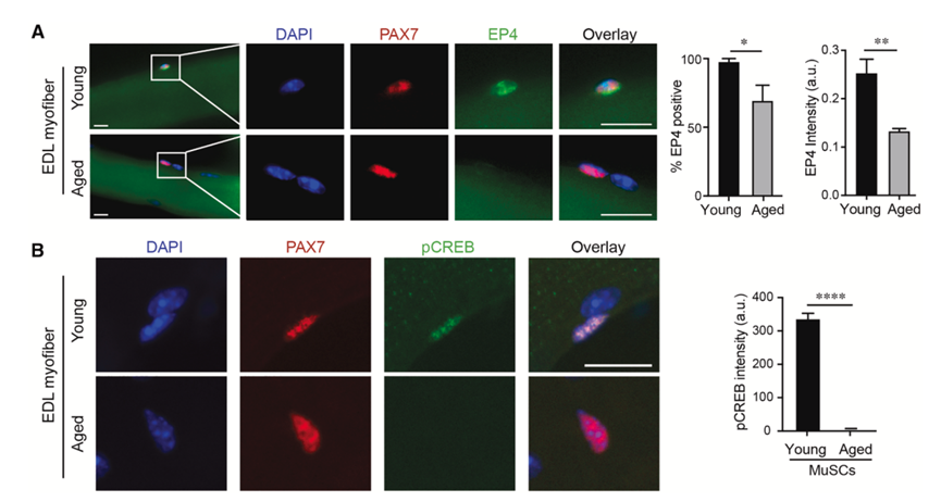 为了评估肌肉细胞中的 PGE2-EP4 信号传导是否会因衰老而受到干扰,他们从年轻小鼠(2-4 个月)和老年小鼠(>18 个月)中分离了肌纤维及其相关的肌肉细胞。几乎所有年轻 Pax7+ 肌肉细胞都表达 PGE2 受体 EP4,但只有 70% 的老年肌肉细胞表达 EP4(图 3 A)。此外,与年轻小鼠相比,EP4+衰老肌肉细胞中 EP4 受体的表达水平降低了约 50%(图 3 A)。替代 PGE2 受体不能补偿衰老肌肉细胞中 EP4 水平的降低,与老年肌肉中 EP4 表达和 PGE2 水平的降低一致,衰老肌肉细胞中环磷酸腺苷反应元件结合蛋白 (CREB) 的磷酸化几乎不存在(图 3 B)。总体而言,这些发现表明,PGE2 水平降低和 EP4 表达降低的复合效应导致老年 MuSC 中 CREB信号传导显著受损。