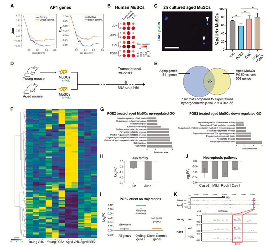 (A) AP1 基因(Jun和Fos)在伪时间轨迹中的循环和分化轨迹中的表达。(B) AP1家族基因表达分析。(C) 代表性显微镜图像。(D)实验方案。(E) 衰老和衰老 MuSC 中 PGE2 治疗中差异表达基因的重叠。(F) 载体和 PGE2 处理的年轻和老年 MuSC 中恢复活力的基因的表达。(G)GO分析。(H) 衰老MuSC 中Jun 家族成员(Jun和Jund)变化分析。(I) 在循环(聚类1)或直接分化(聚类2-6)中富集的基因变化。(J) 坏死性凋亡途径关键基因变化分析。(K) ChromBPNet 重要性得分。