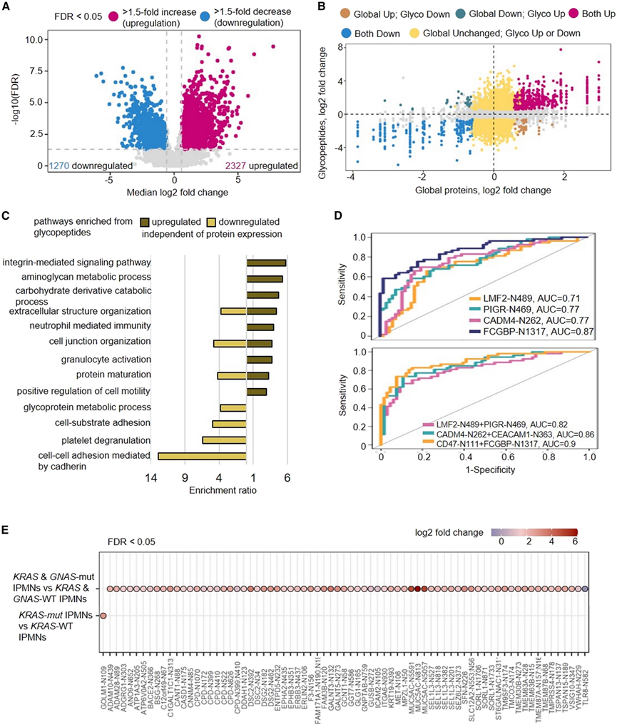 超过130种蛋白质在整体蛋白质和糖蛋白水平上均上调。这些包括粘蛋白(MUC5AC、MUC6和MUC13)和粘蛋白型O-聚糖合成酶(C1GALT1C1、GALNT3、GALNT6和GCNT1)。细胞外基质(ECM)相互作用蛋白,例如CD47、整合素(ITGA2、ITGA9、ITGB4、ITGB6和ITGB8)和层粘连蛋白(LAMA3、LAMB3和LAMC2),也在整体蛋白质和糖蛋白水平上调,表明IPMN中的肿瘤微环境发生了变化。糖肽表达与整体蛋白质表达的比较表明,一些表达差异仅在糖肽水平观察到,而其他表达差异仅在蛋白质水平观察到(图 3B)。这一发现强调了表征蛋白质和糖肽的重要性,因为蛋白质表达可能并不总是等同于糖基化修饰。为了揭示 IPMN 中糖蛋白表达与蛋白质表达相比的独特模式,他们分析了整体蛋白质表达保持不变的上调或下调糖肽的生物学功能。一些上调的糖蛋白在整合素介导的信号传导和白细胞迁移中发挥作用,表明肿瘤微环境发生了变化(图 3C)。在整体蛋白质表达保持不变的情况下,IPMN 糖蛋白质组中的代谢相关功能也上调。下调的糖蛋白包括那些参与由钙粘蛋白介导的细胞间粘附的糖蛋白,钙粘蛋白是肿瘤进展过程中上皮间质转化(EMT)的重要调节剂。