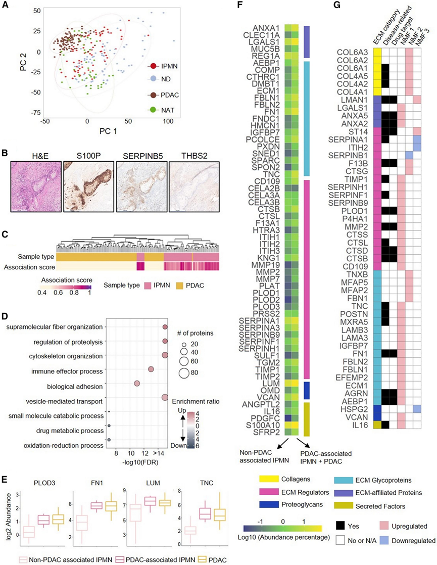 (A) 整个队列的 PCA 分析。(B) 胰腺导管腺癌 (PDAC) 组织中 S100P、SERPINB5 和 THBS2 的 IHC 标记结果。(C) 104 个 PDAC 和 64 个 IPMN 的层次聚类。(D) GO分析。(E) 与 PDAC 分组的 PDAC 相关 IPMN与非 PDAC 相关 IPMN之间显示出显著变化的蛋白质示例。(F) 与非PDAC相关IPMN相比,PDAC相关的IPMN和PDAC具有丰富的ECM蛋白。(G) 根据人类蛋白质图谱,每个 NMF 聚类中与疾病相关和/或潜在药物靶点的 ECM 蛋白均有差异表达。