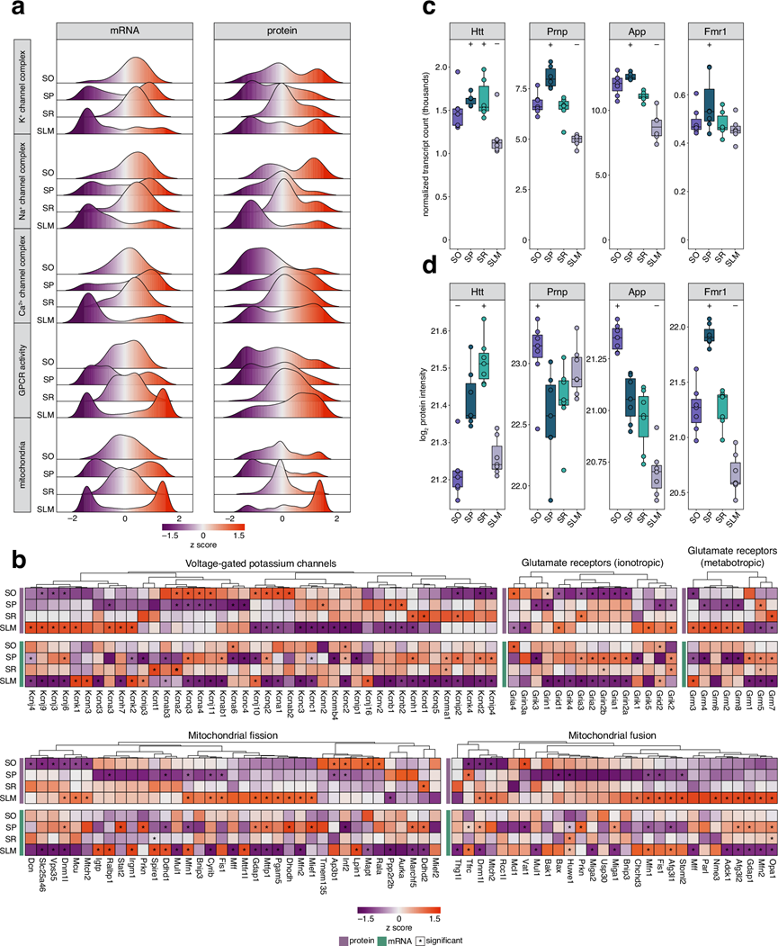 CA1区各层次的分子多样性促进了不同特性的形成,其空间区室化塑造了神经元信号传递和新陈代谢等过程。通过分析归属于五个GO注释的所有分子(聚焦于膜蛋白)的分布,对于所有离子通道类别,其mRNA均显示出在SP最显著的富集趋势,这与该层作为转录发生、富含锥体神经元细胞核的特性一致(图5a)。钾通道蛋白在锥体细胞层中呈耗竭状态,而在所有其他层次中均呈现正向富集分布。对于钠或钙可透过的离子通道复合物,其表达分布更具极性。体现这种组织结构的代表性蛋白包括富集于SO而在SLM耗竭的AMPA型谷氨酸受体亚基Gria4,以及在SO耗竭的NMDA型谷氨酸受体亚基Grin2a和Grin2b。这与已知的沿CA1树突的钾、钠、钙通道梯度以及海马体内整体分子梯度一致(图3b)。与受体分布也遵循脑内梯度的现象一致,他们发现GPCR相关蛋白呈现从始层主要耗竭向SLM逐渐富集的转变,GPCR mRNA的分布则较不均匀。线粒体mRNA遵循相似模式,而在SP和SLM中,线粒体蛋白几乎仅在后者的SLM富集。这反映了远端树突因局部线粒体融合/分裂动态而具有的高线粒体含量(图3b)。通过分析涉及线粒体融合与裂变的蛋白质及其mRNA分布,他们发现融合调节因子确实在SLM富集,融合与运输的双重调节因子在SR富集,而代谢与质量控制相关蛋白的混合组则在SO富集。值得注意的是,Mfn1蛋白及其mRNA在SLM共富集,暗示了局部翻译机制的存在。