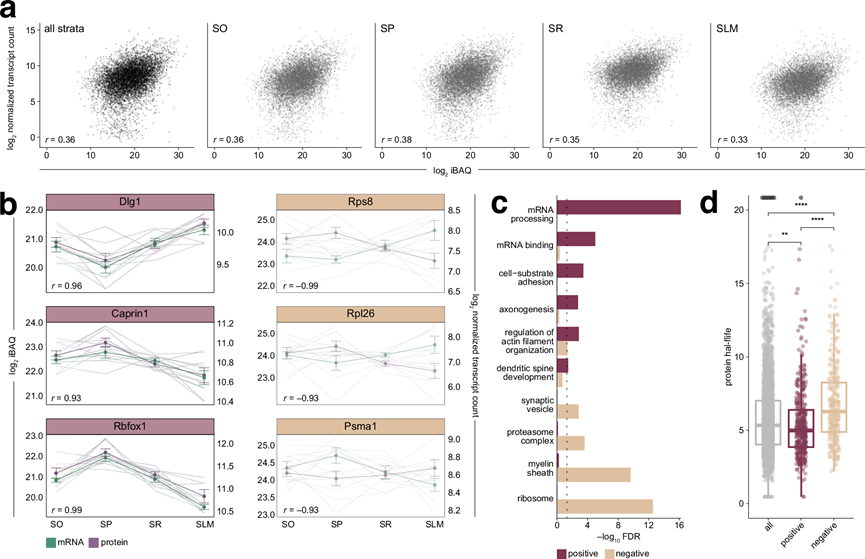(a) CA1 层和每个层内mRNA 平均丰度及其各自蛋白质的 Pearson 相关性。(b) 选定的示例显示它们在各个层的平均丰度变化具有强正(≥0.9)和负(≤-0.9)Pearson 相关性。(c) GO分析。(d) 强正相关和负相关的mRNA-蛋白质对的蛋白质半衰期。