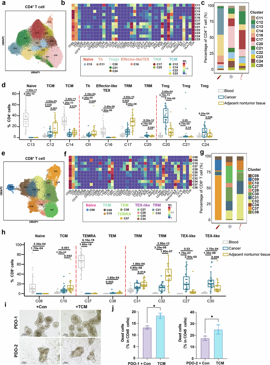 (a) 均匀流形逼近和投影 (UMAP) 图显示了ESCC患者中CD4 +T细胞亚群的分布。(b) 热图显示了 CD4+T 细胞亚群中代表性蛋白标志物的平均表达水平。(c) 堆叠条形图显示了ESCC 患者血液、邻近非肿瘤组织和肿瘤组织中主要 CD4+T 细胞的频率。(d) 箱线图显示了不同来源 ESCC 患者中 CD4+T 细胞亚群的分布。(e) UMAP 图显示了 ESCC 患者中 CD8+ T 细胞亚群的分布。(f) 热图显示了CD8+T 细胞亚群中代表性蛋白标志物的平均表达水平。(g) Sankey 图显示了ESCC 患者血液、正常组织和肿瘤组织中主要 CD8+T 细胞的频率。(h) 箱线图显示不同来源ESCC患者中CD8+T细胞亚群的分布。(i) PDO-1和PDO-2单独培养或与自体CD62L⁺ TCM细胞共培养5天后的明场图像。(j) 死亡肿瘤细胞(CD45⁻细胞群中的膜联蛋白V⁺/PI⁺)的定量分析。