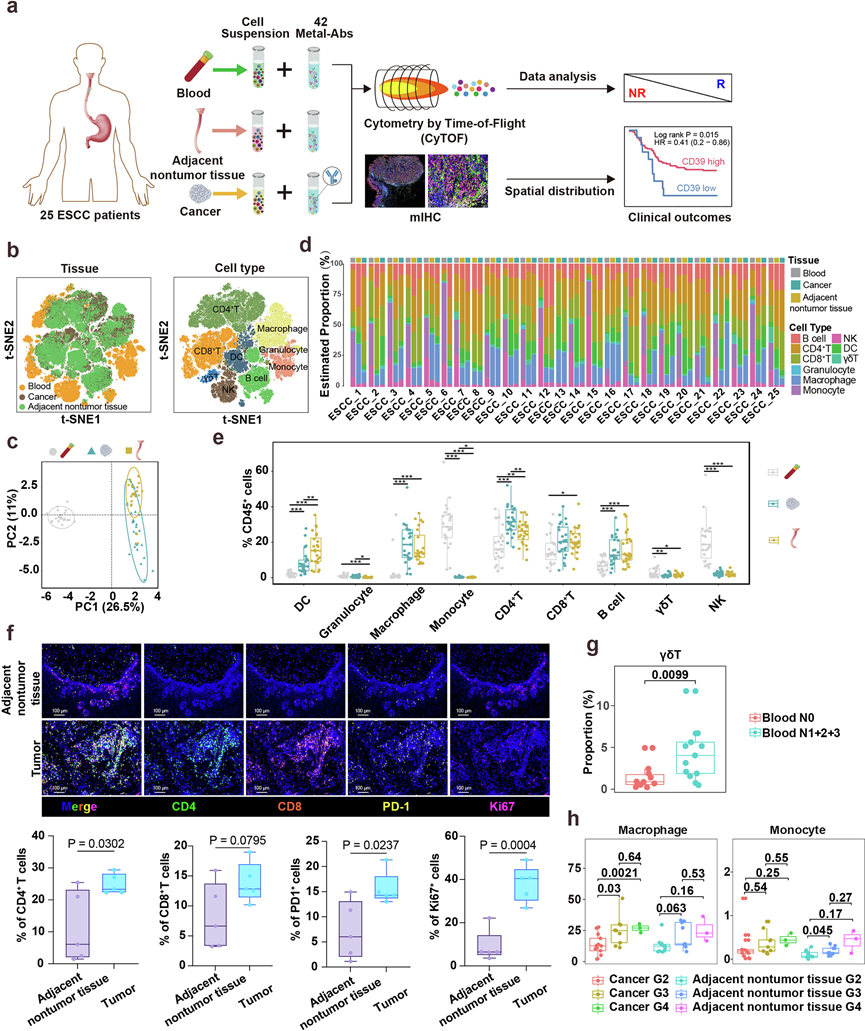(a) 研究流程概述。(b) 食管鳞状细胞癌 (ESCC) 患者主要免疫细胞类型及其来源的 t-SNE 图。(c) PCA图,展示每位 ESCC 患者中 42 个选定标记物的平均表达量。(d) 堆叠条形图,展示ESCC患者血液、邻近非肿瘤组织和肿瘤组织中主要免疫细胞的频率。(e) 箱线图,显示 ESCC 不同组织来源中主要免疫细胞亚群的分布。(f) 采用多重免疫组化 (IHC) 来探索 ESCC 组织内免疫细胞的空间分布。(g) γδ T细胞丰度与淋巴结状态的箱线图。(h) 巨噬细胞在晚期肿瘤(G3和G4)中显著升高。