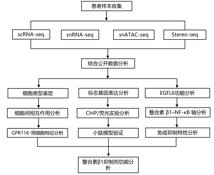 本研究利用单细胞多组学技术揭示了ESCC的细胞和空间结构,并鉴定出一种促进肿瘤转移和免疫治疗耐药性的免疫抑制性GPR116+周细胞亚群。GPR116+周细胞的富集受PRRX1的转录调控,这已通过周细胞特异性Prrx1敲除小鼠得到证实。机制上,GPR116+周细胞分泌EGFL6与癌细胞上的整合素β1结合,激活NF-κB通路,从而促进转移。血清EGFL6可作为多种肿瘤诊断和预后的非侵入性生物标志物。阻断整合素β1可抑制ESCC动物模型中的转移并改善免疫治疗反应。综上所述,我们构建了ESCC中促转移肿瘤微环境的空间分辨图谱,并强调了GPR116+周细胞的生物学和临床重要性,从而为转移性癌症提出了潜在的创新治疗策略。