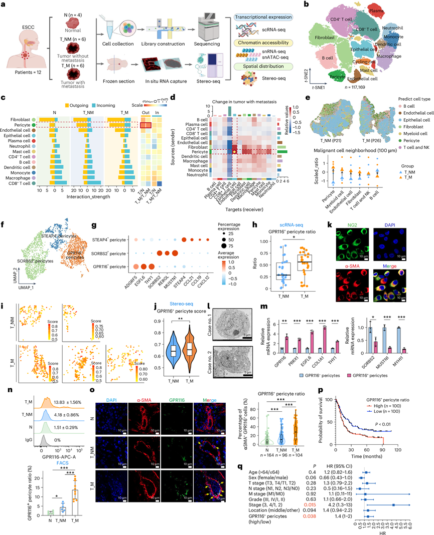(a) 总体研究设计。(b) 对 117169 个细胞进行t分布随机邻域嵌入 ( t -SNE) 可视化。(c) 不同组织间细胞类型的双向细胞间相互作用强度。(d) T_M 和 T_NM 组织中细胞类型间相互作用的差异。(e) 肿瘤周围区域(100 μm)内细胞类型分布的变化。(f) 使用 scRNA-seq 对周细胞进行重新聚类的均匀流形近似和投影 (UMAP) 可视化。(g) 周细胞亚群标记物的散点图。(h) 在整合的食管鳞状细胞癌(ESCC) 数据集中,转移性癌症患者(n = 29)的GPR116+周细胞比例高于非转移性癌症患者。(i)分析ESCC肿瘤区域中GPR116+周细胞评分的空间分布。(j) 使用立体测序技术对转移性癌症患者和非转移性癌症患者(n = 244个细胞)所有周细胞的GPR116+周细胞评分进行统计学比较。(k) 对分离的周细胞进行周细胞标记物(NG2、α-SMA)的免疫荧光染色。(l) 使用透射电镜观察分离的周细胞的亚细胞结构。(m) 对标记物进行 RT-qPCR 分析。(n) 对ESCC新鲜肿瘤中的GPR116+周细胞进行流式细胞分析。(o) 对不同组织中的 GPR116+周细胞进行免疫荧光染色和定量分析。(p) 根据 GPR116+状态对 200 例 ESCC 患者进行分层生存分析。(q) 对200例ESCC患者的9个临床相关因素进行多因素Cox回归分析。