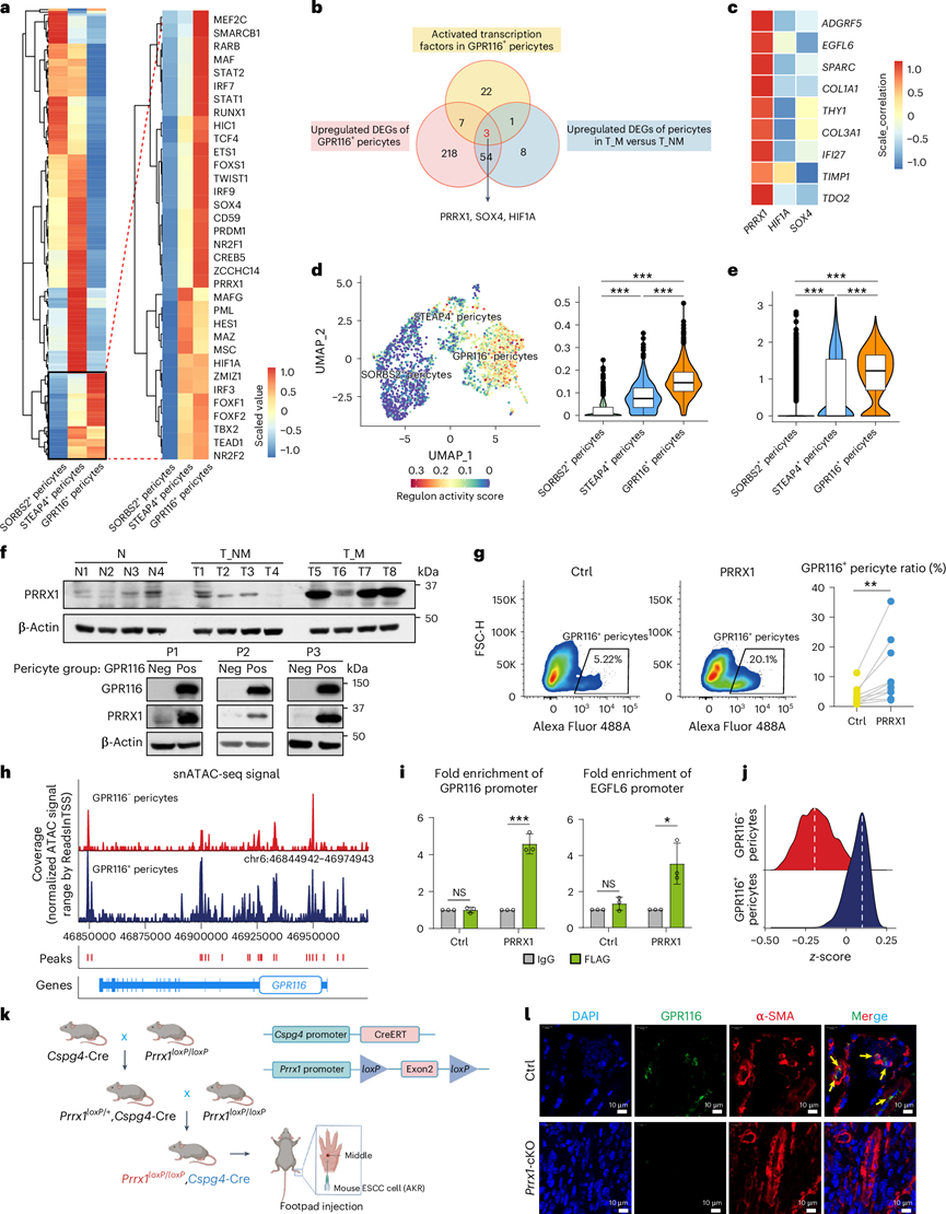 为了阐明GPR116+周细胞的分化机制,他们进行了单细胞调控网络推断和聚类(SCENIC)分析,筛选符合以下三个标准的潜在调控因子:(1)在SCENIC鉴定的GPR116+周细胞中激活(33个基因);(2)在GPR116+周细胞中的表达高于GPR116-周细胞(282个基因);(3)在转移性癌症患者的周细胞中上调(66个基因)。值得注意的是,PRRX1、SOX4和HIF1A符合所有标准(图2a-b)。在这些候选基因中,PRRX1与GPR116+周细胞的主要标志物表现出最强的相关性(图2c)。TCGA队列也验证了PRRX1与GPR116+周细胞之间最强的正相关性。因此,PRRX1成为研究重点。scRNA-seq结果显示,GPR116+周细胞中PRRX1的活性和表达均显著升高(图2d-e)。临床组织和分离的周细胞的免疫印迹分析也显示,转移性癌症患者和GPR116+周细胞中PRRX1显著上调(图2f),这与整合的周细胞数据集一致。