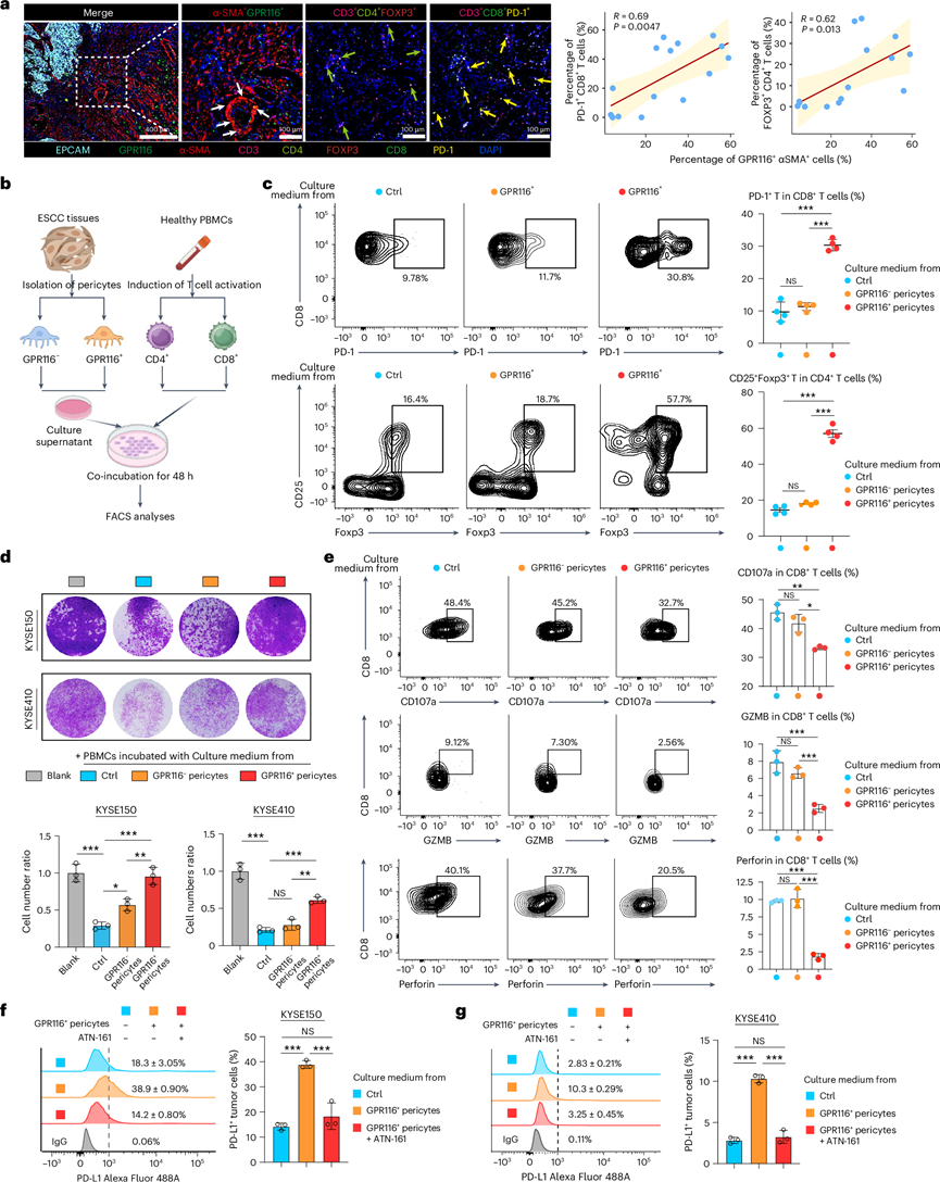 免疫逃逸是癌症进展和转移的主要机制之一。scRNA-seq分析显示,GPR116+周细胞与耗竭的CD8+ T细胞(CTLA4+CD8+T细胞)和Treg细胞(FOXP3+ CD4+ T细胞)之间存在显著的正相关性,这一结果在TCGA的泛癌分析中也得到了证实。多重免疫荧光染色证实,程序性死亡蛋白1(PD-1)+CD8+ T细胞和Treg细胞在GPR116+周细胞周围富集,且二者呈强相关性;在转移性ESCC患者中观察到更高的富集程度(图6a)。与GPR116-周细胞共培养导致 PD-1+CD8+和 FOXP+CD4+ T 细胞数量较 GPR116-周细胞增加(图6b-c)。用 GPR116+周细胞条件培养基处理可显著降低外周血单核细胞 (PBMC) 的肿瘤杀伤活性(图6d)和 CD8+ T 细胞的细胞毒性效应分泌(图6e)。重要的是,GPR116+周细胞显著上调癌细胞中程序性死亡配体 1(PD-L1)的表达,而这种作用可由整合素β1抑制剂逆转(图6f-g)。综上所述,这些结果突显了GPR116+周细胞通过以下途径发挥免疫抑制作用:(1) 促进Treg细胞扩增;(2)诱导 CD8+ T细胞耗竭并降低其细胞毒性;(3)上调肿瘤细胞中的 PD-L1 以逃避免疫监视,其作用可由整合素 β1 抑制减弱。