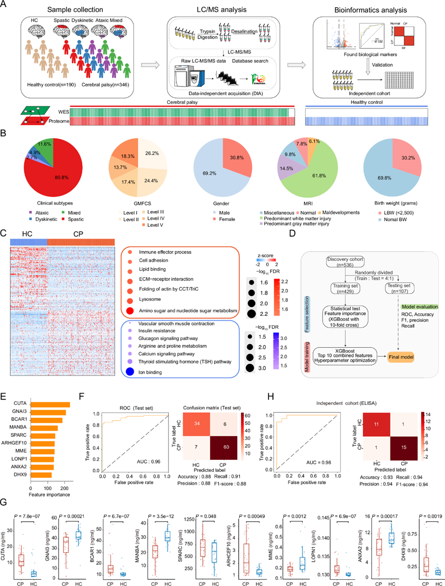 (A) 蛋白质组学工作流程概述了三个模块:样本采集、LC/MS分析和数据分析。(B) 饼图显示了 CP 样本的临床信息,包括临床亚型、MRI 结果、性别、GMFCS 分级和出生体重。(C) 热图和气泡图展示了区分 CP 组和健康对照组 (HC)的独特蛋白质和通路。(D) 示意图展示了用于开发分类器以识别 CP 组和健康对照组样本的机器学习框架。(E) 使用基于XGBoost 的模型区分 CP 组和健康对照组的特征重要性。(F) 基于蛋白质组学结果,受试者工作特征(ROC)曲线展示了多生物标志物模型在测试集中的性能。(G) 箱线图展示了 验证队列中,使用ELISA检测的CP组和HC组之间10个诊断蛋白的差异。(H) ROC曲线展示了多生物标志物模型在测试集中的性能。