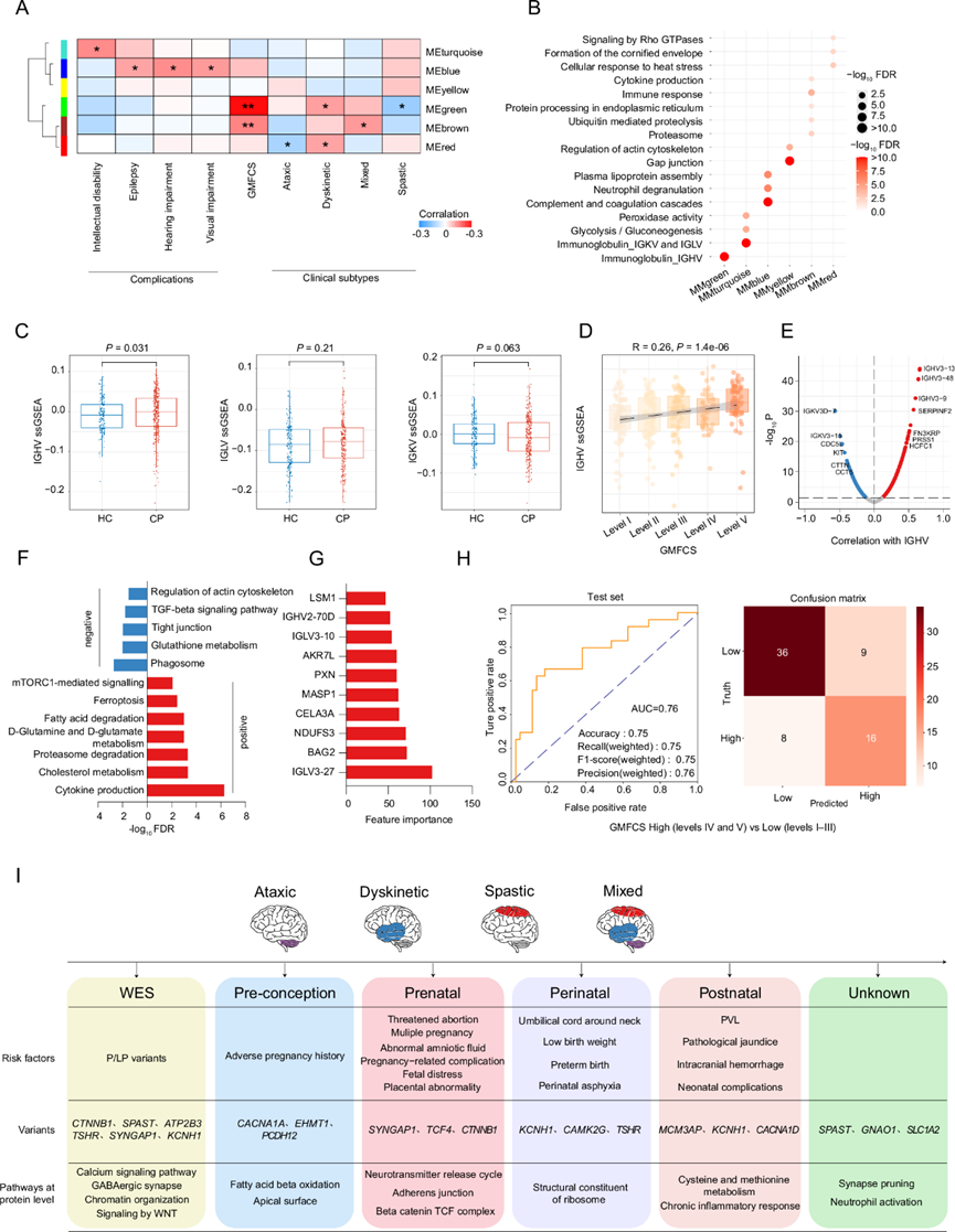 (A) 热图显示了WGCNA分析获得的模块与各种临床结果之间的相关性。(B) 不同模块在蛋白质水平上的富集通路。(C) 箱线图显示了CP组和健康对照组在蛋白质水平上IGHV、LGLV和IGKV的ssGSEA评分。(D) 散点图显示了IGHV评分与GMFCS之间的Spearman相关性。(E) 火山图显示了IGHV评分与蛋白质之间的Spearman相关性。(F) 条形图显示了在蛋白质水平上与IGHV ssGSEA评分显著相关的蛋白质中富集的通路。(G) 条形图显示了使用基于XGBoost的模型筛选出的特征重要性排名前10的蛋白质。(H) 图形总结突出了对346名CP儿童和190名健康对照者的血清蛋白质组进行整合分析的关键分子发现。(I) 示意图总结了结果。