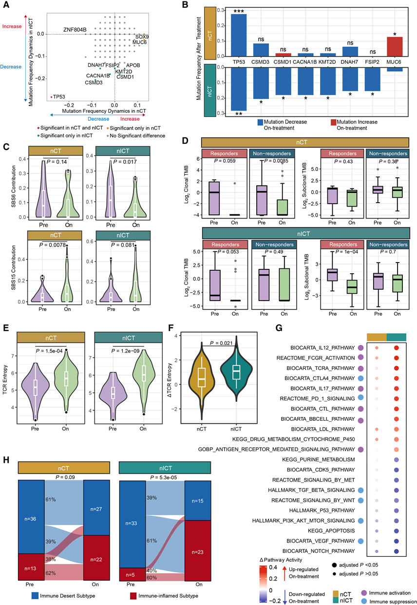 NEOSUMMIT-01队列基线样本的基因改变图谱与既往报道基本一致,具有相似的肿瘤突变负荷(TMB)(图1C)以及相似的显著突变基因(SMG)突变频率,包括TP53、ARID1A和KRAS(图S1C和S1D)。他们进一步分析了nICT和nCT患者治疗前和治疗期间样本的分子特征,包括体细胞改变、通路活性和免疫特征,以研究治疗诱导的基因动态变化。nICT治疗后,包括两个SMG(TP53和CSMD3)在内的多个基因的突变频率显著降低。相比之下,nCT组中仅TP53突变频率显著降低,而MUC6突变频率则升高。这些结果表明,nICT 可能更有效地降低肿瘤负荷,而 nCT 可能促进携带特定突变的克隆细胞的增殖(图2A-B)。接下来,他们对已知的 COSMIC SBS(单碱基替换)特征进行了分析,并评估了它们在每个样本中的贡献。nICT 组中 SBS6 的贡献显著降低,而 nCT 组中 SBS15 的贡献显著升高(图 2C)。由于SBS6和 SBS15 均与错配修复缺陷(dMMR)肿瘤密切相关,他们在排除 dMMR 样本(n = 2)后重复了分析,结果相似。