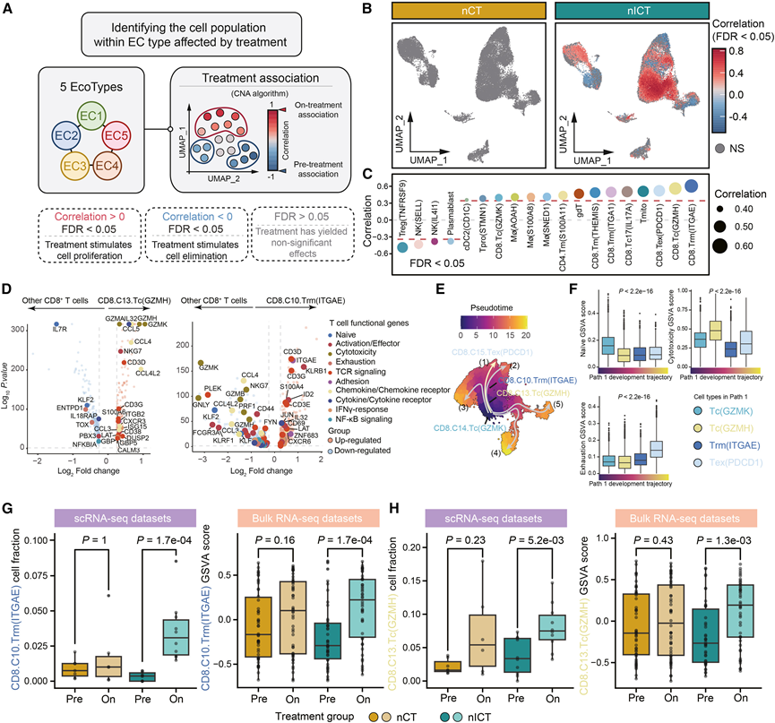 (A) 工作流程图展示了受治疗影响的 EC 类型内的细胞群。(B) UMAP图显示了治疗对EC1细胞状态的影响。(C) 点图显示 EC1 中每个细胞状态下 FDR <0.05 的细胞的平均相关性。(D) 火山图显示了 CD8.C13.Tc(GZMH)或 CD8.C10.Trm(ITGAE)与其他 CD8+ T 细胞相比的特异性基因表达。(E) UMAP 图显示了 CD8+ T 细胞的分化。(F) 箱线图显示了轨迹(1)分化过程中幼稚、细胞毒性和耗竭功能状态的变化。(G-H) 箱线图显示了多组学数据。