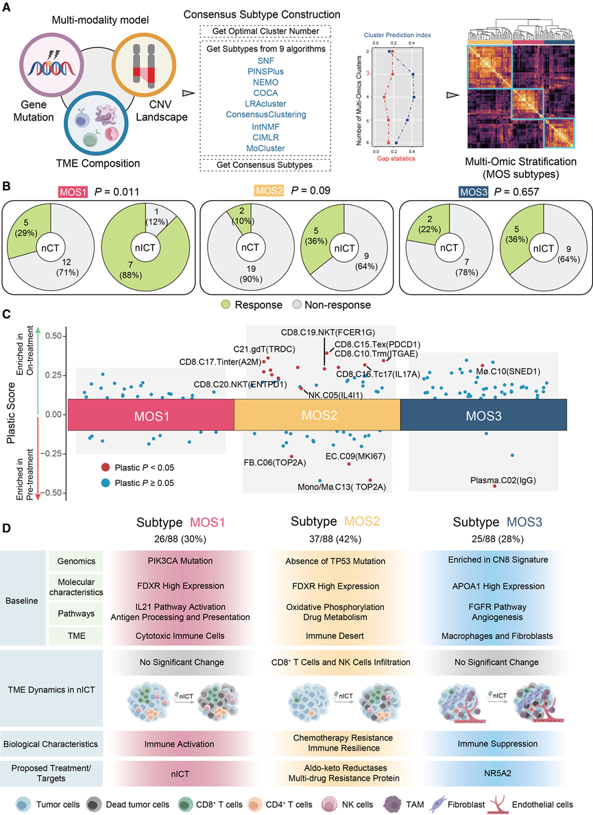 除了TME之外,肿瘤细胞的重要性也不容忽视。为了建立一个全面的亚型来对胃癌患者接受新辅助化疗(nICT)的疗效进行分层,必须同时考虑肿瘤细胞和TME的特征。他们从基因组和RNA测序数据集中综合提取了215个组织特征[84种细胞类型、57个突变特征和74个拷贝数变异(CNV)特征],构建了一个能够区分可能从nICT治疗中获益的患者的系统。他们利用无监督算法集成和共识聚类策略,最终识别出三种多组学亚型(MOS1至MOS3)(图8A)。临床分析表明,不同MOS亚型的患者对nICT和新辅助化疗(nCT)的反应存在差异(图8B)。与nCT相比,MOS1型患者从nICT治疗中获益显著,而MOS3型患者未见显著获益。