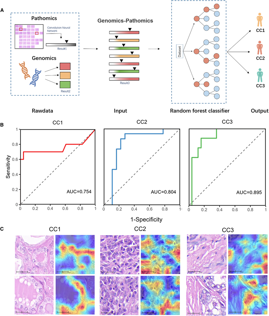 由于基于质谱的蛋白质组学分析成本高昂、分析周期长且技术要求复杂,因此该蛋白质组学分类的直接临床应用面临诸多挑战。为了克服这些局限性并提高分子分类的临床适用性,他们开发了一种快速、经济且便捷的工作流程,该流程利用了两种易于获取的临床数据:(1) 数字病理全切片图像 (WSI) 和 (2) 来自基于 NGS 的基因检测panel的基因突变数据,从而能够对三种蛋白质组学 CC 亚型进行稳健的预测。探究了三种甲状腺癌亚型的肿瘤是否表现出不同的病理模式,以及卷积神经网络(CNN)模型能否通过数字病理分析区分它们。他们利用全部113例入组患者的WSI,构建了一个深度学习流程,用于训练CNN模型以对三种甲状腺癌亚型进行分类。然后,他们将三种最常见的致病基因改变(BRAFV600E突变、RAS突变和TERT启动子突变)与基于CNN的病理组学模型相结合,并使用随机森林算法在遗传规划(GP)框架内构建了一个分类器(图3A)。交叉验证结果表明,该GP框架对所有三种亚型均具有较强的预测性能,CC1、CC2和CC3的曲线下面积(AUC)值分别为0.754、0.804和0.895,显著优于仅使用基因组或病理组学数据的模型(图3B)。