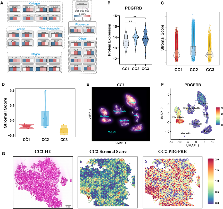 (A) 发现队列中 CC 亚型中特征蛋白家族(包括胶原蛋白、层粘连蛋白、血小板反应蛋白、整合素、纤连蛋白等)的丰度。(B) 小提琴图比较了发现队列中不同CC亚型中PDGFRB蛋白的表达情况。(C) 小提琴图比较了外部队列 1(n = 10)中 scRNA-seq 数据在单细胞水平上不同 CC 亚型的基质评分。 (D) 小提琴图比较了外部队列 1中单细胞 RNA 测序数据在样本水平(伪体积)上不同 CC 亚型的基质评分。(E) 密度图可视化展示了外部队列 1 中四个 CC2 样本中七种主要细胞类型的丰度。(F) UMAP 可视化图显示了外部队列 1 中四个 CC2 样本的七种主要细胞类型中 PDGFRB 基因的表达。(G) 代表性CC2肿瘤(P3)的H&E染色切片(左图)和基质评分(通过ESTIMATE算法计算,中图)和PDGFRB基因表达(右图)的空间转录组学图谱。
