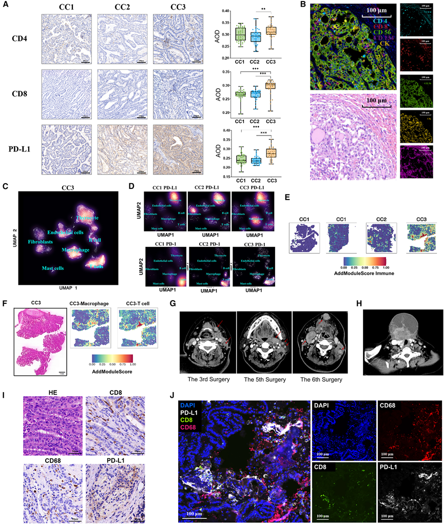 (A) 各CC亚型CD4、CD8和PD-L1的代表性IHC染色切片(左图)。箱线图比较了发现队列所有病例IHC染色中CD4 +T细胞(右上)、CD8+T细胞(右中)和PD-L1表达(右下)的丰度。(B) 来自探索队列中一名广泛侵袭性滤泡性甲状腺癌(FTC)患者的代表性CC3肿瘤的多重免疫荧光染色。(C) 密度图可视化展示了外部队列 1 中四个 CC3 样本中七种主要细胞类型的丰度。(D) 密度图可视化展示了外部队列 1(n = 10)中 CC 亚型样本中 PD-L1 和 PD-1 的单细胞表达谱。(E) 利用来自外部队列 1 中四名患者的 spRNA-seq 数据,对免疫评分进行空间转录组学映射:两名患有 CC1 肿瘤(P1、P2),一名患有 CC2 肿瘤(P3),一名患有 CC3 肿瘤(P9)。(F) H&E 染色切片(左,比例尺,1mm)和基因表达谱的空间转录组学映射,推断代表性 CC3 肿瘤(P9)中巨噬细胞(中)和 T 细胞(右)的分布。(G)来自外部队列 1 的代表性 CC3 肿瘤患者(P8)的第三次、第五次和第六次颈部手术的术前增强颈部 CT 图像。(H) 来自外部队列 1 的代表性 CC3 患者(P10)的原发肿瘤的 CT 图像。(I) 来自外部队列 1 中代表性 CC3 肿瘤患者(P9)的 H&E 染色和 CD8、CD68 和 PD-L1 IHC 图像。(J) 来自外部队列 1 的代表性 CC3 肿瘤患者(P7)的多重免疫荧光染色显示。