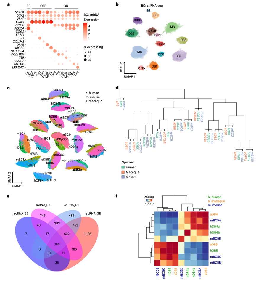(a) BC类型标记基因的分布。(b) 人类BC类型的UMAP可视化。(c) 人类、小鼠和猕猴BC的共嵌入。(d) 小鼠BC类型的层次聚类。(e) 利用snRNA-seq和scRNA-seq数据集,分析了人类GB和BB中排名靠前的基因的重叠情况。(f) 小鼠BC5A、BC5B、BC5C和BC5D细胞类型与人类和猕猴中已定位细胞类型的相似性。