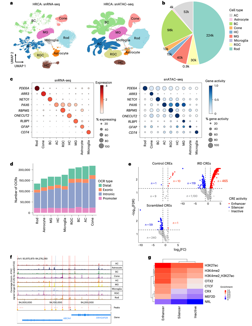 (a) snRNA-seq 和 snATAC-seq 共嵌入细胞的 UMAP 图,显示细胞聚类为主要的视网膜细胞类型。(b) 饼图显示主要视网膜细胞类型的细胞比例分布。(c) 散点图显示 snRNA-seq 检测的标记基因表达和 snATAC-seq 获得的相应细胞类型的标记基因活性评分。(d) 柱状图显示每个主要细胞类型中鉴定的 OCR 数量。(e) 火山图显示CRE活性。(f) 基因组轨道显示了ABCA4基因座周围的假定CRE。(g) 热图显示了基于已发表的ChIP-seq数据集。
