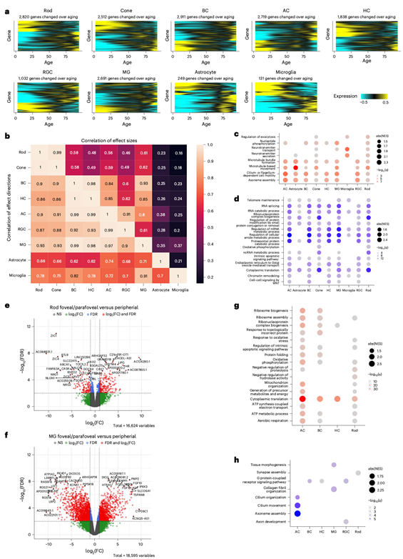 (a) 热图展示了利用线性混合模型(LMM)鉴定的视网膜细胞类型中,衰老过程中DEG的动态变化。(b) 热图展示了利用多因素分析(MASH)确定的细胞类型中,衰老过程中差异基因表达效应大小(右上三角形)和效应方向(左下三角形)的相关性。(c-d) 富集分析。(e) 火山图展示了视杆细胞中中央凹/旁中央凹和周边视网膜之间的DEG。(f) 火山图展示了视神经球状细胞(MG)中中央凹/旁中央凹和周边视网膜之间的DEG。(g-h) 富集分析。