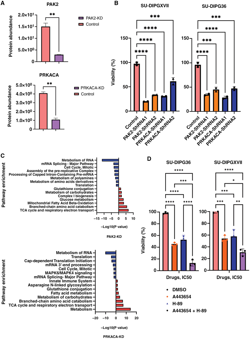 (A) 质谱分析证实了基于shRNA的DMG(SU-DIPGXVII)细胞中PAK2和PRKACA的敲低(shRNA1和2联合应用)。(B) PAK2和PRKACA敲低对SU-DIPGXVII和SU-DIPG36细胞体外培养96小时的生长影响。(C) 与对照细胞相比,PAK2和PRKACA敲低细胞中差异表达蛋白的通路富集分析。(D) PKA和AKT1药物对DMG细胞体外培养72小时的生长影响。