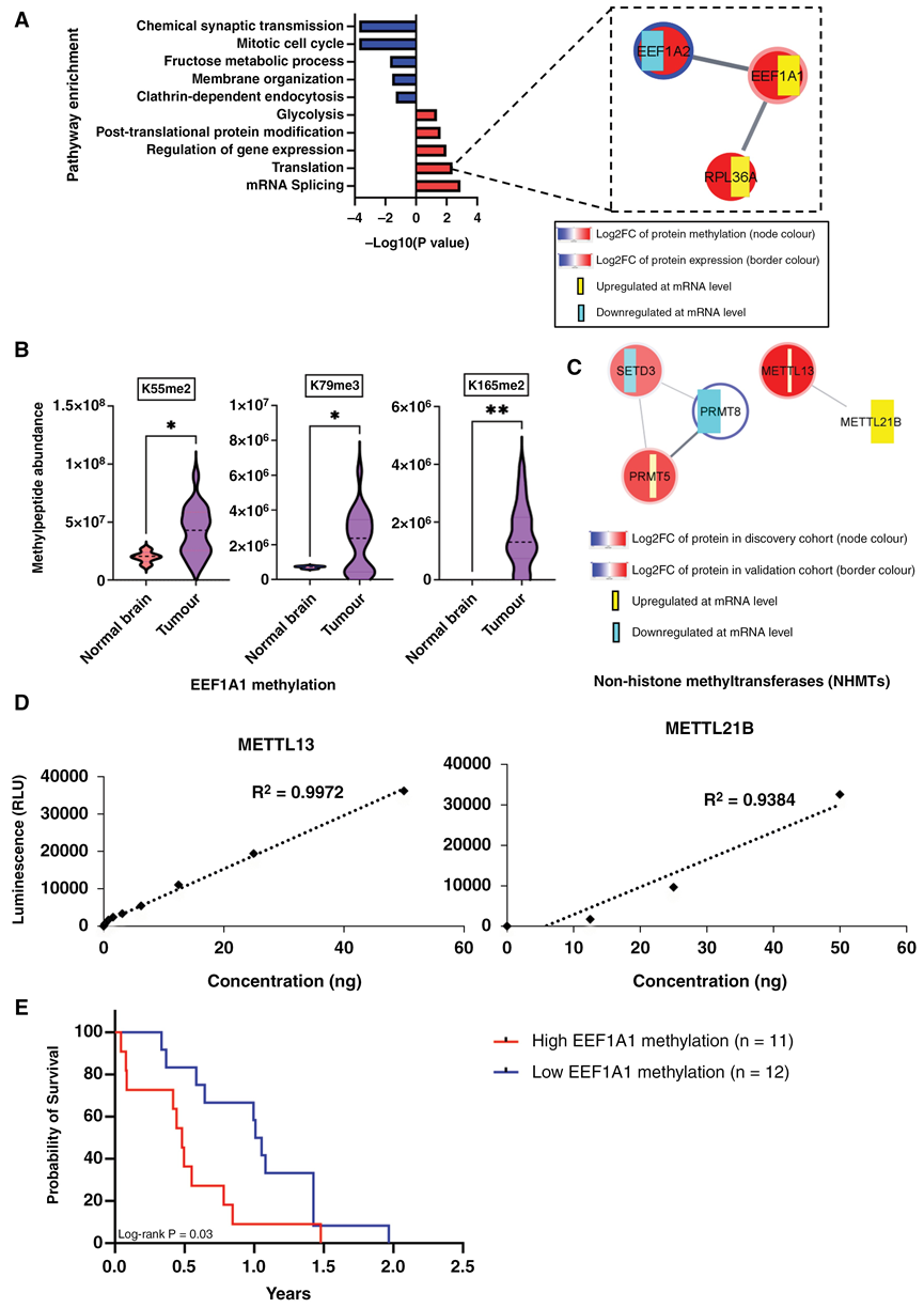 在 EEF1A1 和 EEF1A2 这两个亚型中,只有 EEF1A1 在 DMG 中相对于正常脑组织上调。相反,EEF1A2 在正常脑组织中的表达水平极低,在 DMG 中则进一步下调。METTL13 在蛋白水平上高表达,且其底物高度甲基化,表明 METTL13 在 DMG 中具有活性。METTL21B 在 DMG 中 mRNA 水平显著高表达,但在蛋白质组队列中未检测到)。基于质谱的大型蛋白质组学数据中缺失值相当常见,可以通过多重插补方法或靶向蛋白质组学来解决。通过Western blot证实了DMG中EEF1A1、METTL13和METTL21B的表达水平升高。此外,通过从肿瘤蛋白裂解物中免疫沉淀 EEF1A1,然后使用抗泛甲基赖氨酸抗体进行蛋白质印迹分析,验证了 DMG 组织中 EEF1A1 的甲基化。因此,METTL13 和 METTL21B 过表达,并且它们的底物高度甲基化,表明这些非组蛋白甲基转移酶在 DMG 中具有活性,并可能代表一种新的治疗靶点。