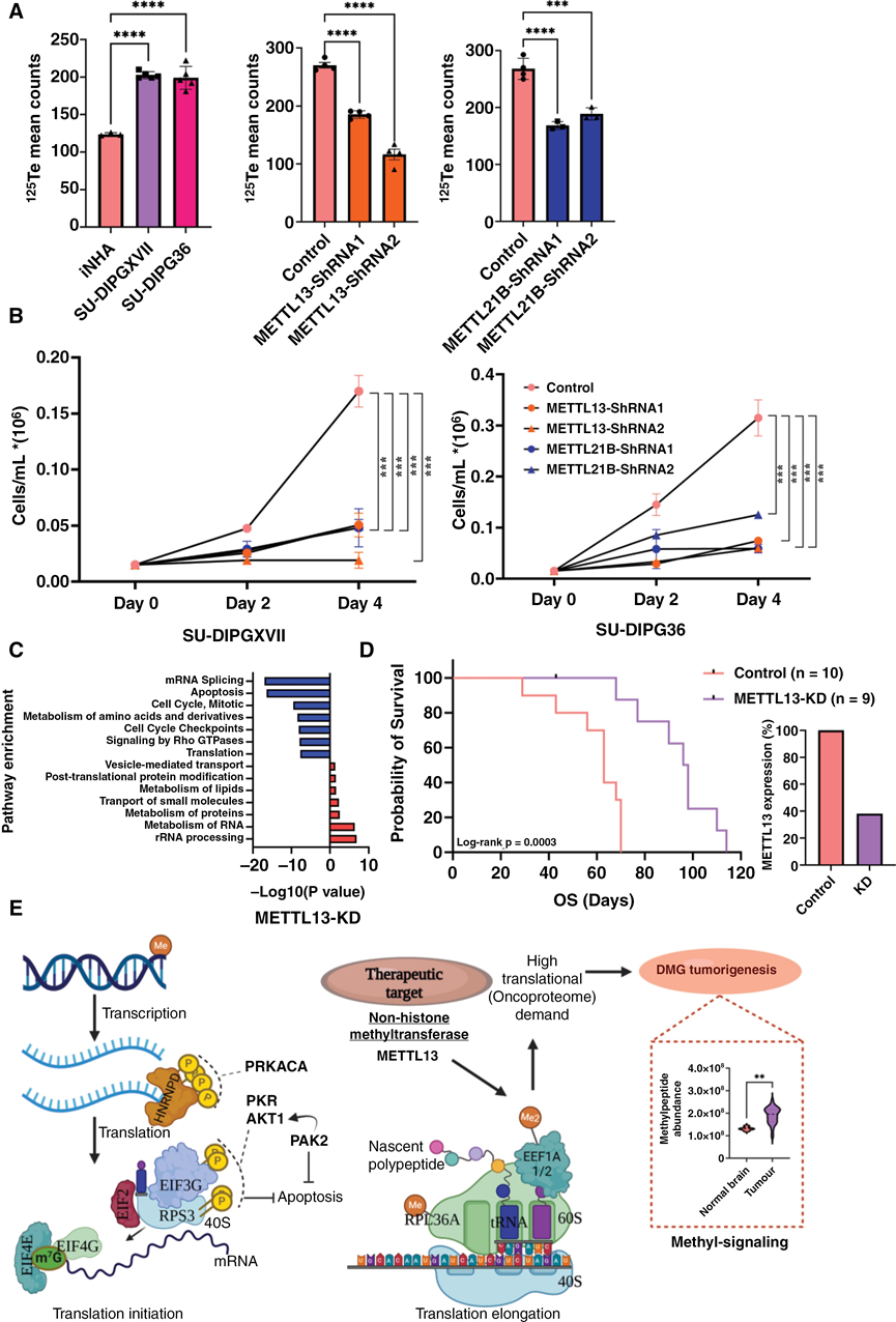 (A) 敲低 METTL13 和 METTL21B 显著降低了 SU-DIPG36 细胞的整体蛋白质合成。DMG 细胞的蛋白质合成显著高于对照 iNHA 细胞。(B) 敲低 METTL13 和 METTL21B 对体外 DMG 细胞生长的影响。(C) 与对照细胞相比,METTL13 敲低细胞中差异表达蛋白的通路富集分析。(D) 在体内 DMG 异种移植模型中,敲低 METTL13 可提高小鼠的生存率。对照组和 METTL13-KD 小鼠的中位生存期分别为 63 天和 97 天。本实验使用了 METTL3-ShRNA2。(E) 激酶和 METTL13 底物及其对翻译机制和 DMG 肿瘤发生的影响的整合模型。